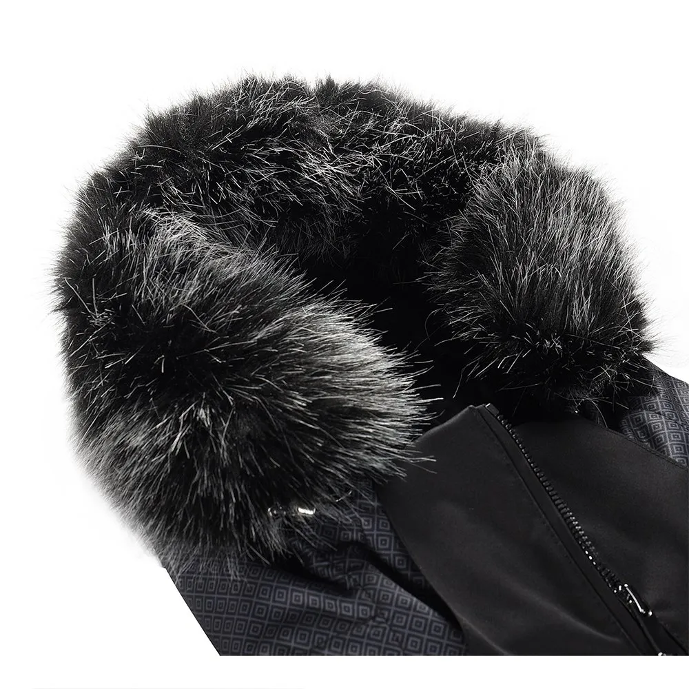 La chaqueta de invierno para mujer con hermosa piel sintética en la capucha ofrece un relleno muy cálido, costuras selladas, un cálido cuello interior hecho de material muy cómodo, mangas de forma anatómica, con un puño de velcro en la parte inferior y un puño elástico interno para el pulgar, práctica ventilación en las axilas con cremalleras y un cinturón para nieve con inserciones elásticas para un rango máximo de movimiento que se puede quitar fácilmente.