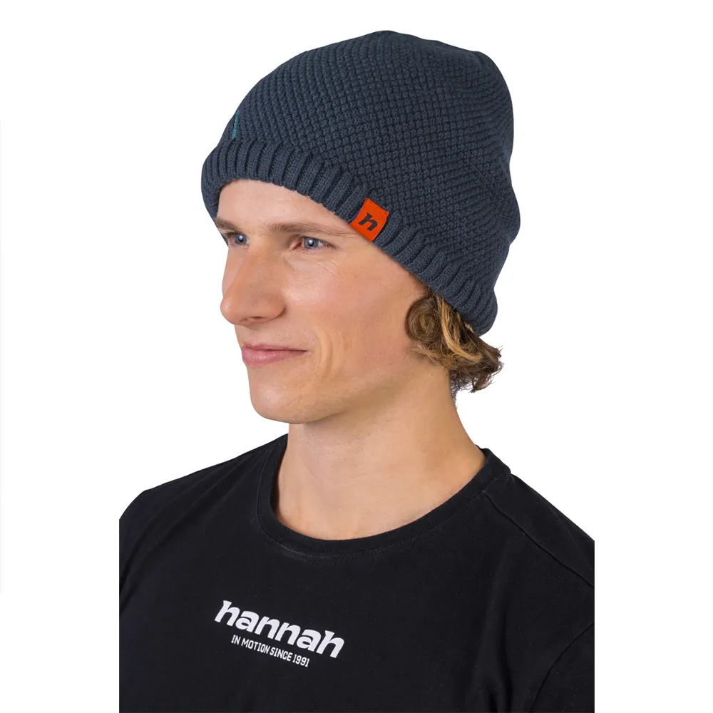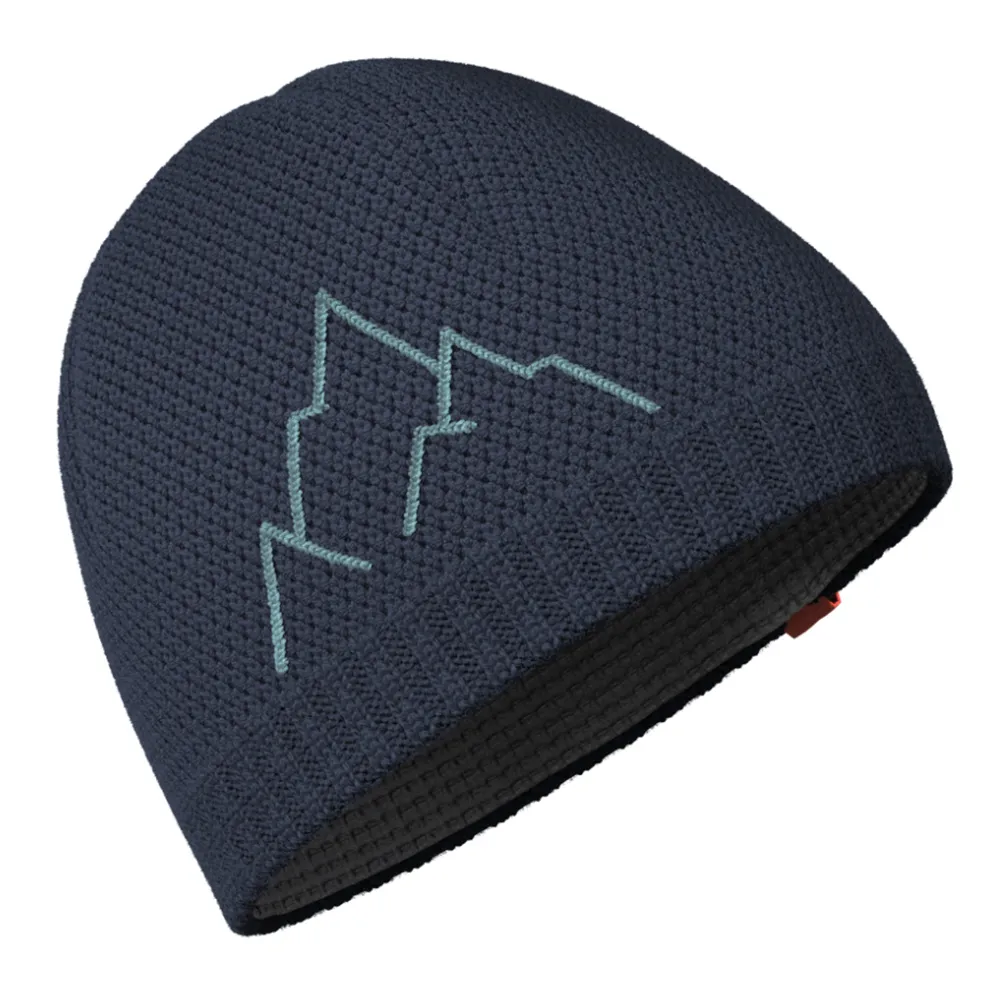 En el dobladillo inferior, el tejido del gorro termina en un punto elástico que se ajusta bien a la cabeza y el diseño moderno en material natural se subraya con el bordado en contraste de las montañas.