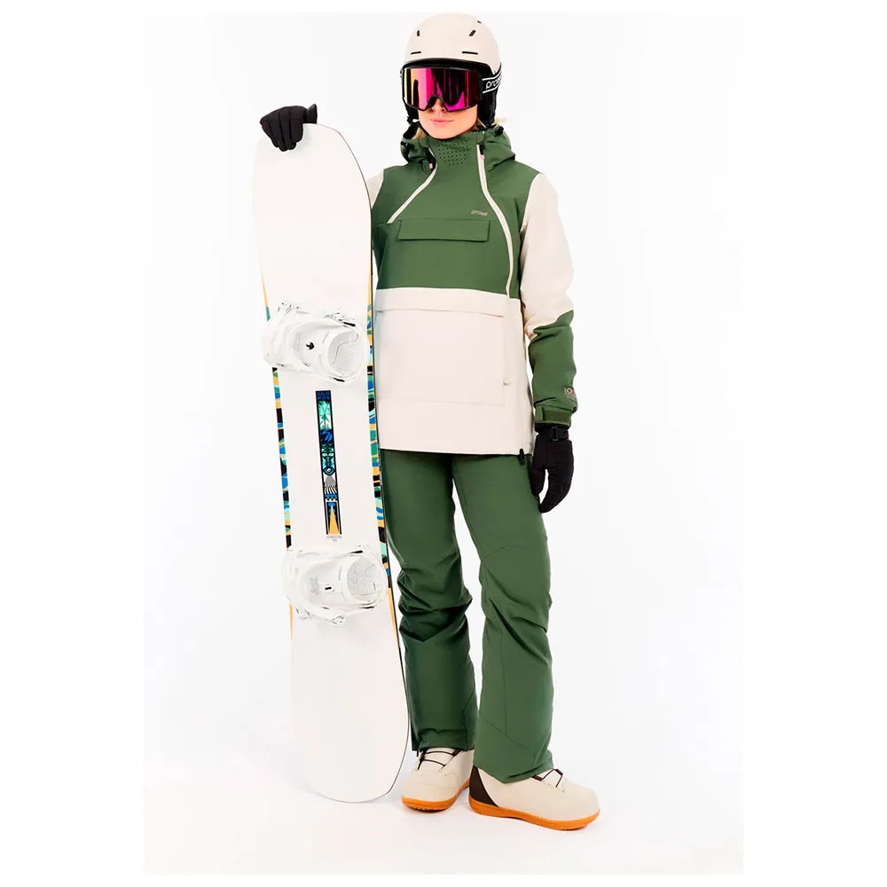 Cuenta con un índice de repelencia al agua de 10K, tejido transpirable de 10 g, costuras críticas, puños interiores con orificios para los pulgares, cremalleras de ventilación en las axilas, bolsillo para el forfait y polaina protectora en la cintura para garantizar que te mantengas seco, cómodo y preparado.