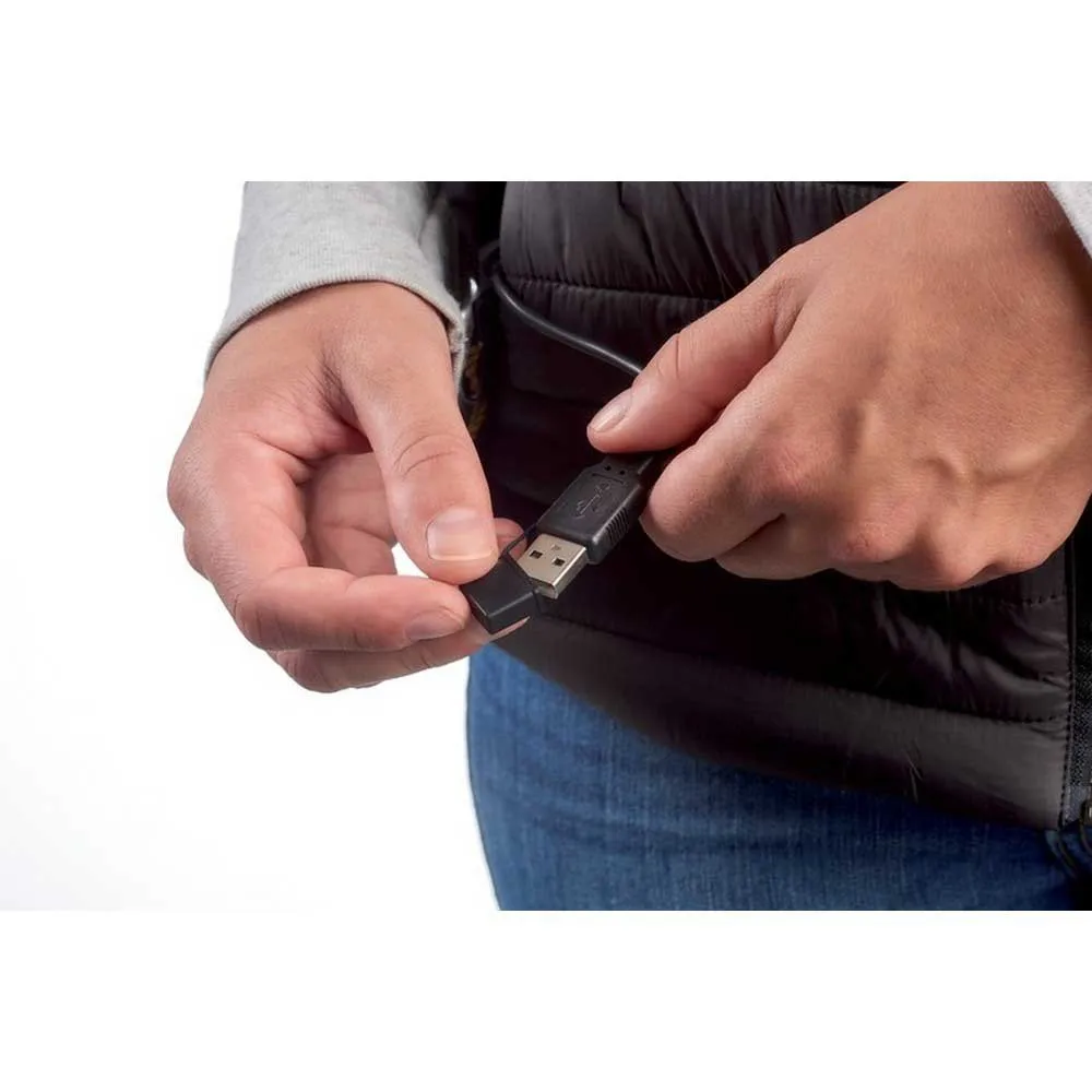Los elementos calefactables se activan simplemente al conectar una batería/powerbank USB externa (no incluida) al cable USB del interior del bolsillo del chaleco - Es compatible con cualquier tipo de batería externa (recomendamos la batería powerbank Universal Therm-ic por su diseño compacto y su capacidad).