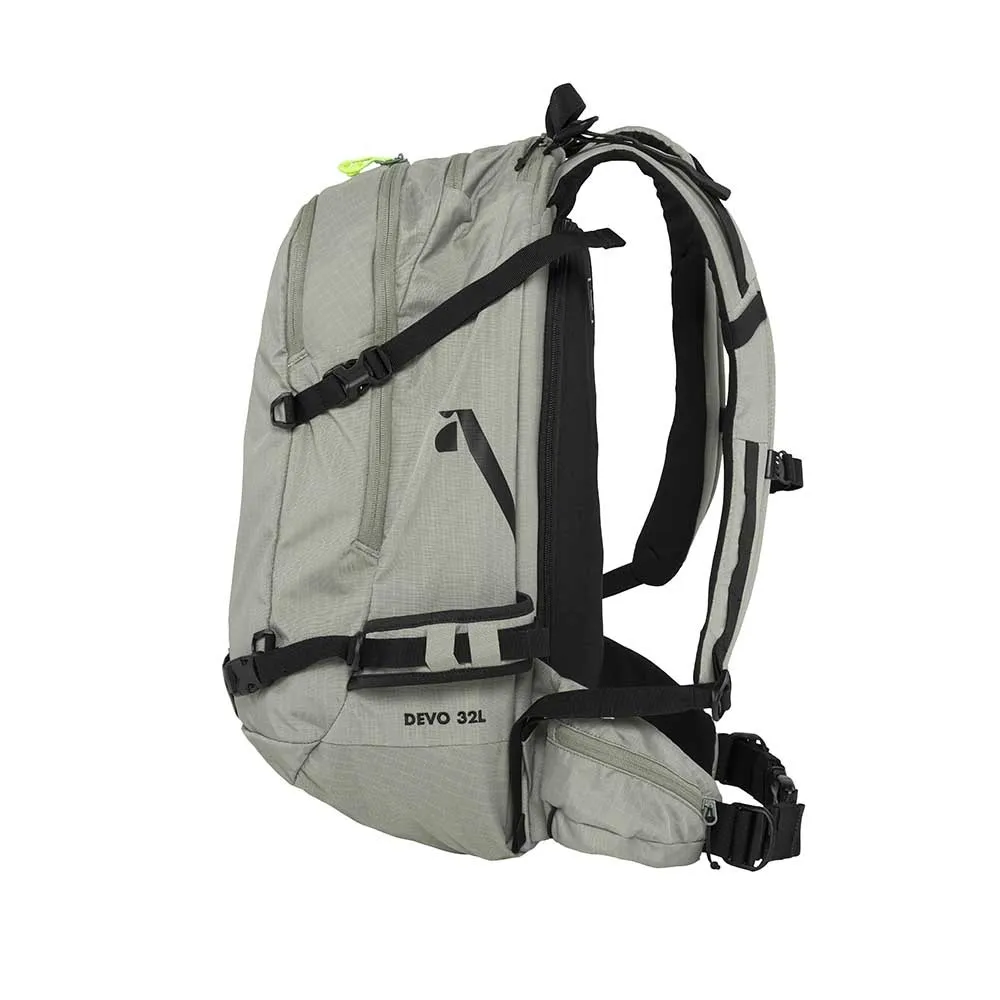 Devo 32L on hienosäädetty reppu niin takamaasto- kuin rinnekäyttöönkin, ja siinä on harkitusti suunniteltuja ominaisuuksia, kuten useita kantovaihtoehtoja varusteille ja erillinen tasku pelastusvälineille. Se on riittävän tilava pitkille retkille, mutta kevyt ja matalaprofiilinen, joten sitä on mukava käyttää huomaamatta, kun vauhti kiihtyy.