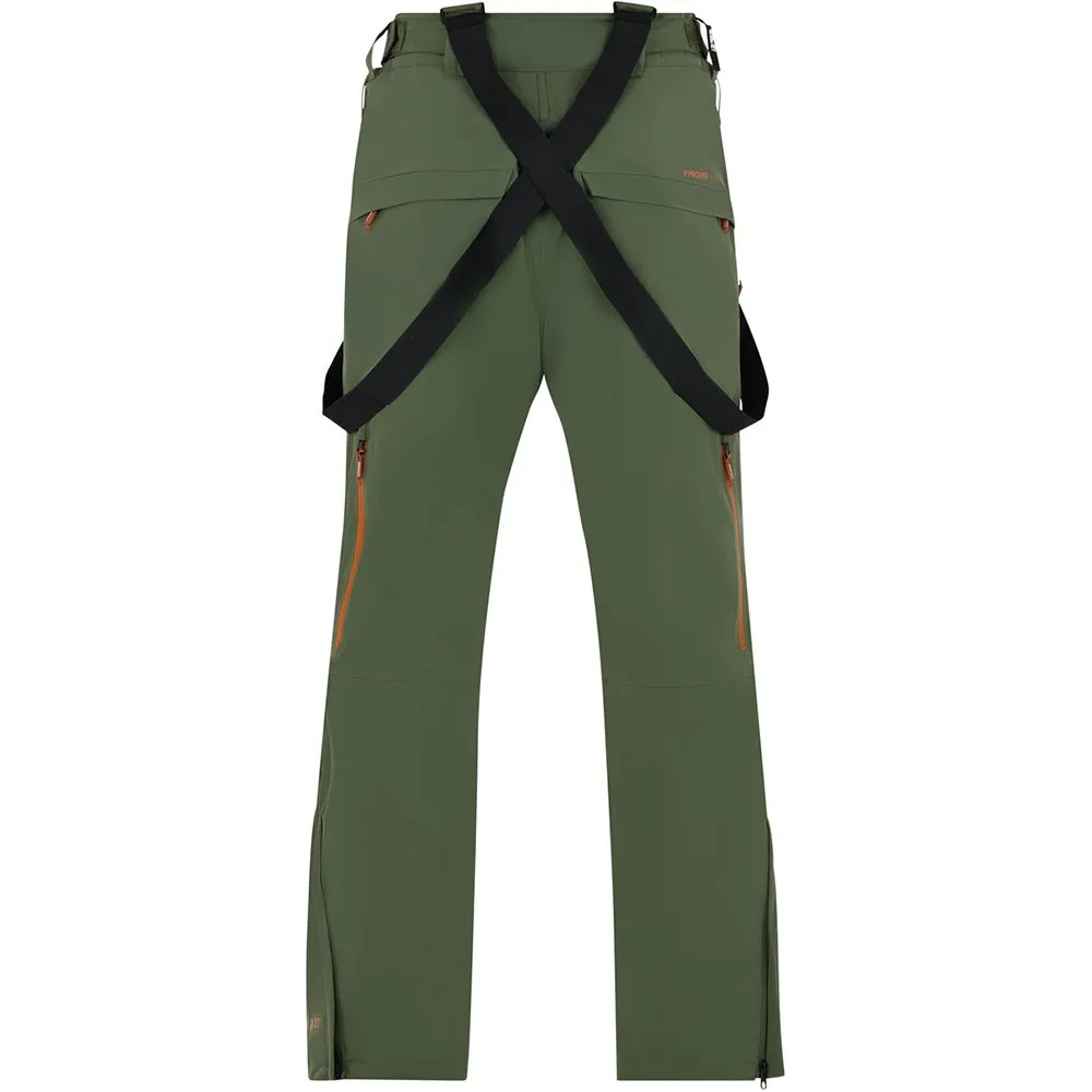 Kiinteä vyötärönauhalenkki painikkeilla, käänteinen nylon vetoketju sivutaskuissa, kontrastiväriset teipatut vetoketjut ja tuuletusvetoketjut sivusessa lahkeessa, käänteinen nylon vetoketju takana taskunläpän takana, vyötärön säätö tarranauhalla, yläosassa ommellut rypyt muotoilluissa polvissa, pyöristetty pohja, vetoketju lahkeen alaosassa, irrotettavissa olevat joustavat olkahihnat, muotoillut lahkeet.