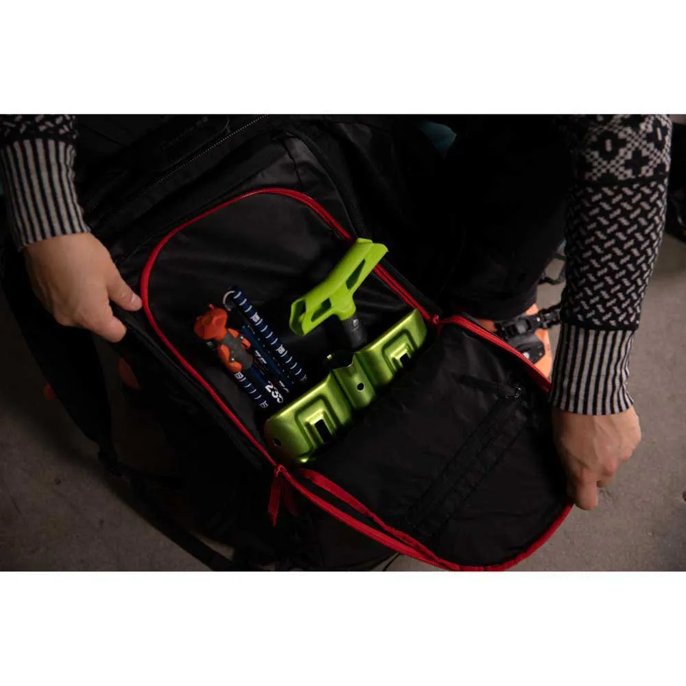 Notre pack airbag E2 à part entière avec toute la gamme de fonctionnalités, y compris notre poche Side Stash en nylon enduit imperméable, la fermeture éclair Back Stash, la fermeture éclair d'accès latéral incurvée, les sangles amovibles pour ski/snowboard/compression, la poche de ceinture de hanche, le panneau arrière "cooling fin" ventilation et poche dédiée aux outils de sécurité.