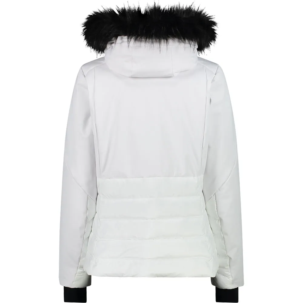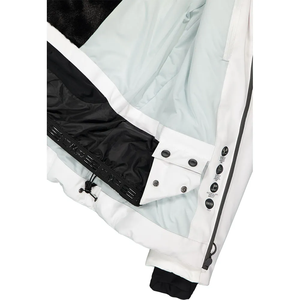 Il capo è completato dal cappuccio staccabile con pelliccia sintetica, dalla zip frontale con patta antivento e anti-sfregamento, dall´orlo regolabile con coulisse, da due tasche laterali con zip e dalla tasca porta skipass sulla manica