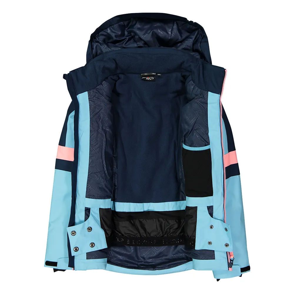 Giacca con polsini regolabili con velcro e polsini interni in Lycra con foro per il pollice, zip frontale con patta antivento e anti-sfregamento, orlo regolabile con coulisse, due tasche laterali con zip e una tasca per lo skipass sulla manica.