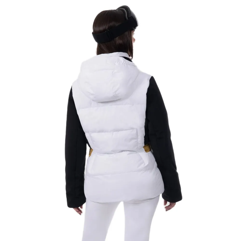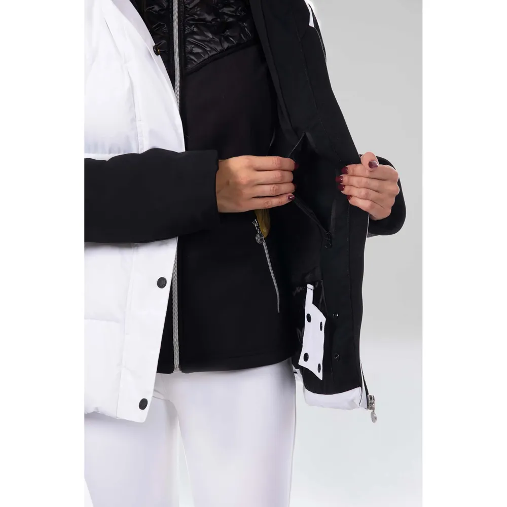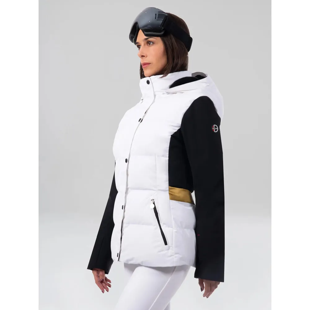 Al centro del design della Elea c´è il suo imbottitura sintetica isolante all´avanguardia. Questa imbottitura ad alto loft è progettata per intrappolare il calore corporeo con incredibile efficienza, fornendo un calore eccezionale anche nelle giornate più fredde. A differenza della piuma tradizionale, mantiene le sue proprietà isolanti anche quando è umida e offre una silhouette elegante e lusinghiera senza ingombri inutili. Ciò consente una completa libertà di movimento e un look raffinato che passa senza problemi da una giornata di sci dinamico a una serata di relax après-ski.