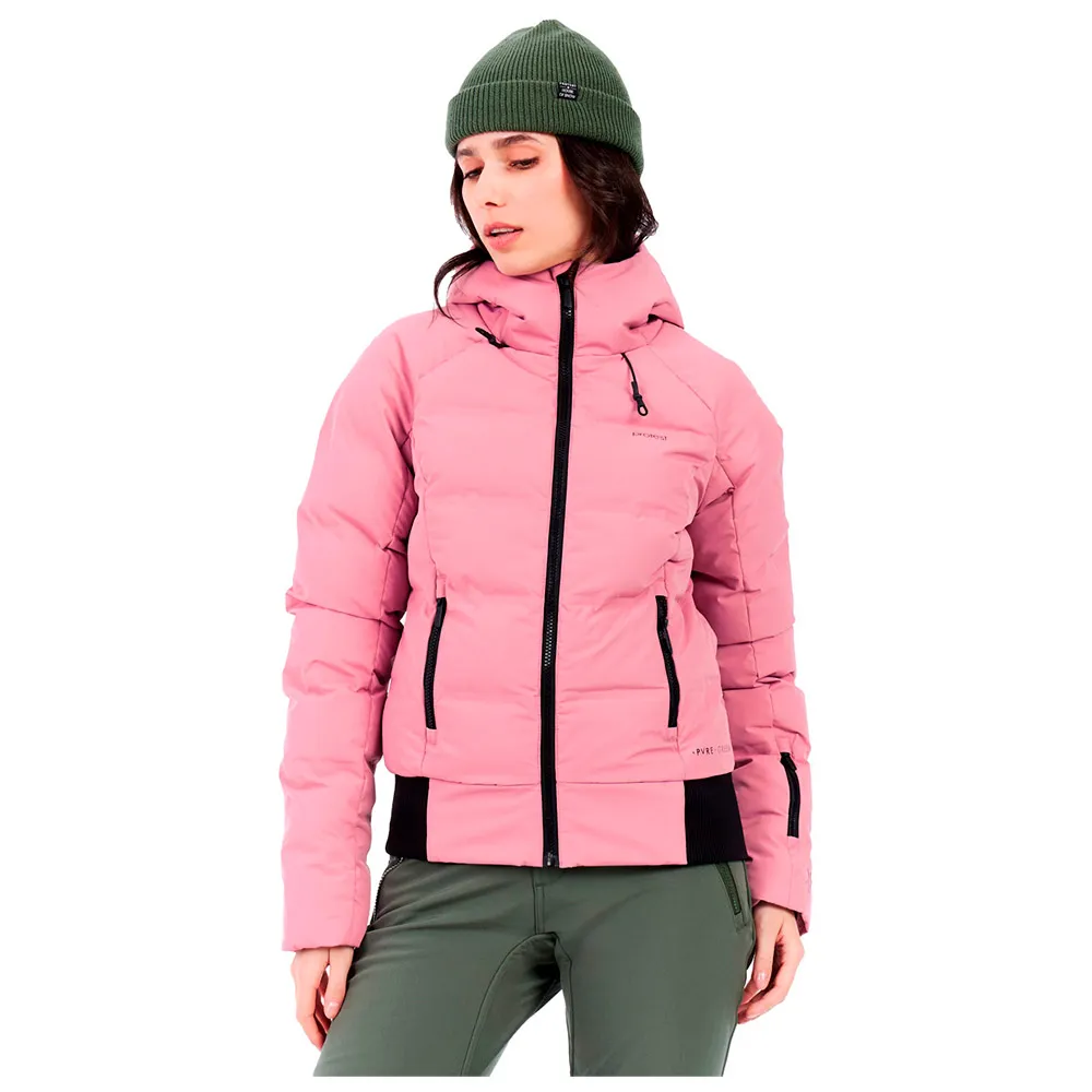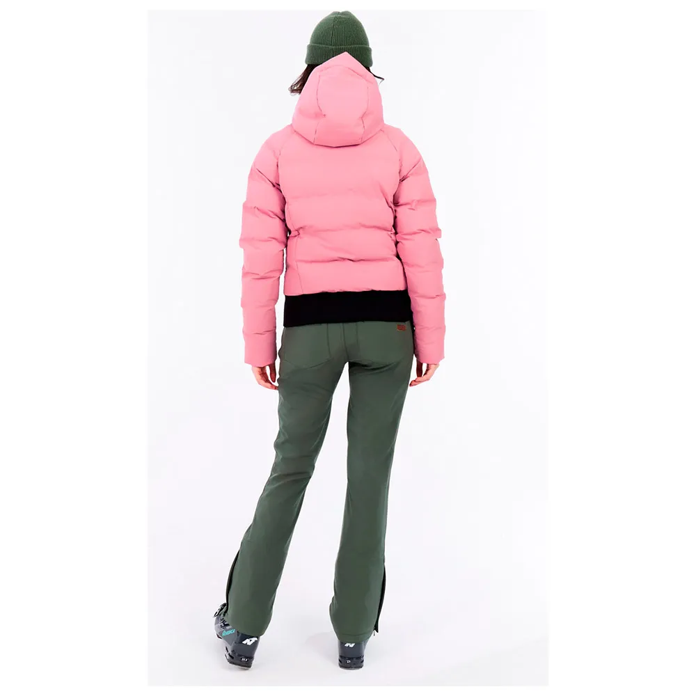 De ski- en snowboardjas heeft een regular fit met een korte lengte, wat een chique touch toevoegt.