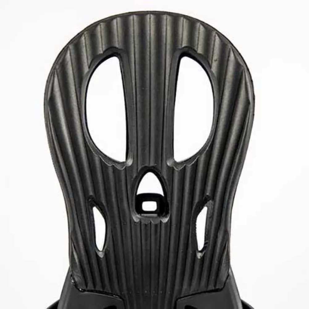 - Hjørnene på bunnplaten til bindingene er avrundet for å redusere et hardt friksjonspunkt der bindingen og brettet møtes. De avrundede hjørnene under bindingen gjør at brettet kan bøye seg mer naturlig rundt innbindingsbunnbrettet også, noe som gir en mer naturlig tur og mindre stress for brettet i disse områdene.