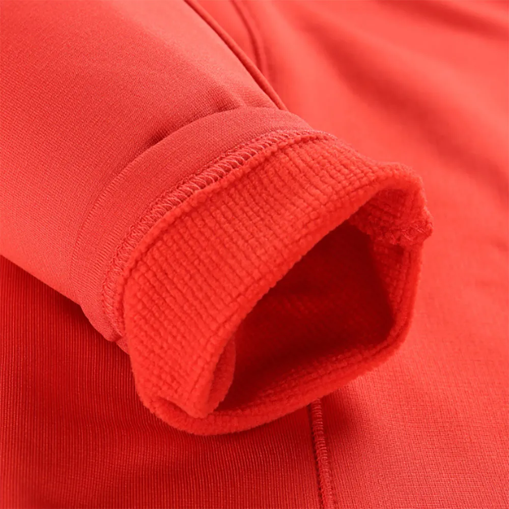 mikropolar, teksturowany, krój anatomiczny, krótki kontrastowy zamek, osłona podbródka, nadruk z przodu.