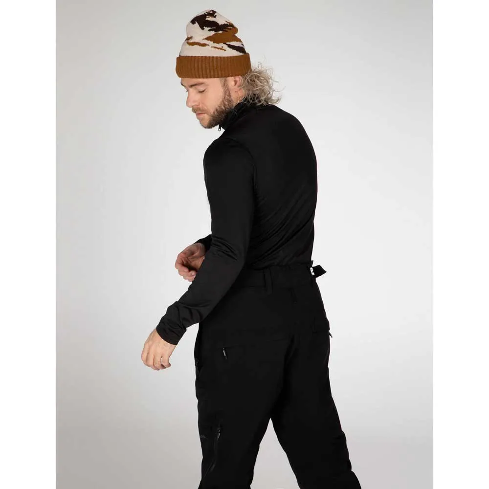 Solidne zamknięcie w pasie z zatrzaskami, odwrócony nylonowy zamek w bocznych kieszeniach, kontrastowe uszczelnione suwaki i zamki wentylacyjne z boku nogawki, odwrócony nylonowy zamek za klapką kieszeni z tyłu, regulowana talia na rzep, górne szyte zaszewki na wstępnie uformowanych kolanach, okrągłe zakrzywione dół, dół nogawek zapinany na zamek, odpinane elastyczne szelki, wyprofilowane nogawki.
