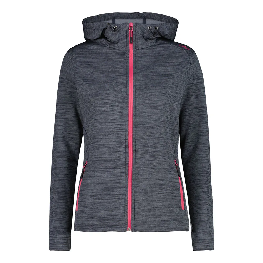 Jaqueta feminina mesclada com capuz fixo, feita de fleece elástico de alto desempenho, com um design justo, isolante e respirável.