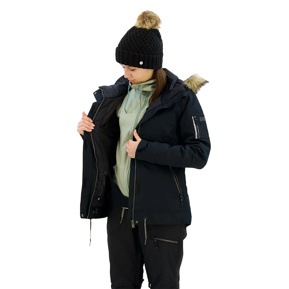 Clipe de chave, saia de tafetá fixa, sistema de saia de pó snap-away, sistema de fixação de jaqueta à calça, ventilação nas axilas forradas de malha, polainas de pulso elásticas internas, ajustador de punho de manga, tecnologia ROXY HydroSmart integrada na gola, protetor de queixo, ROXY WarmLink compatível com cinto.
