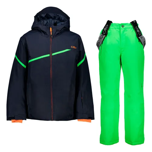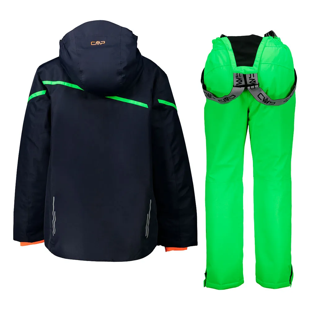 Skidset bestående av avtagbar jacka med huva plus byxor med hängslen.