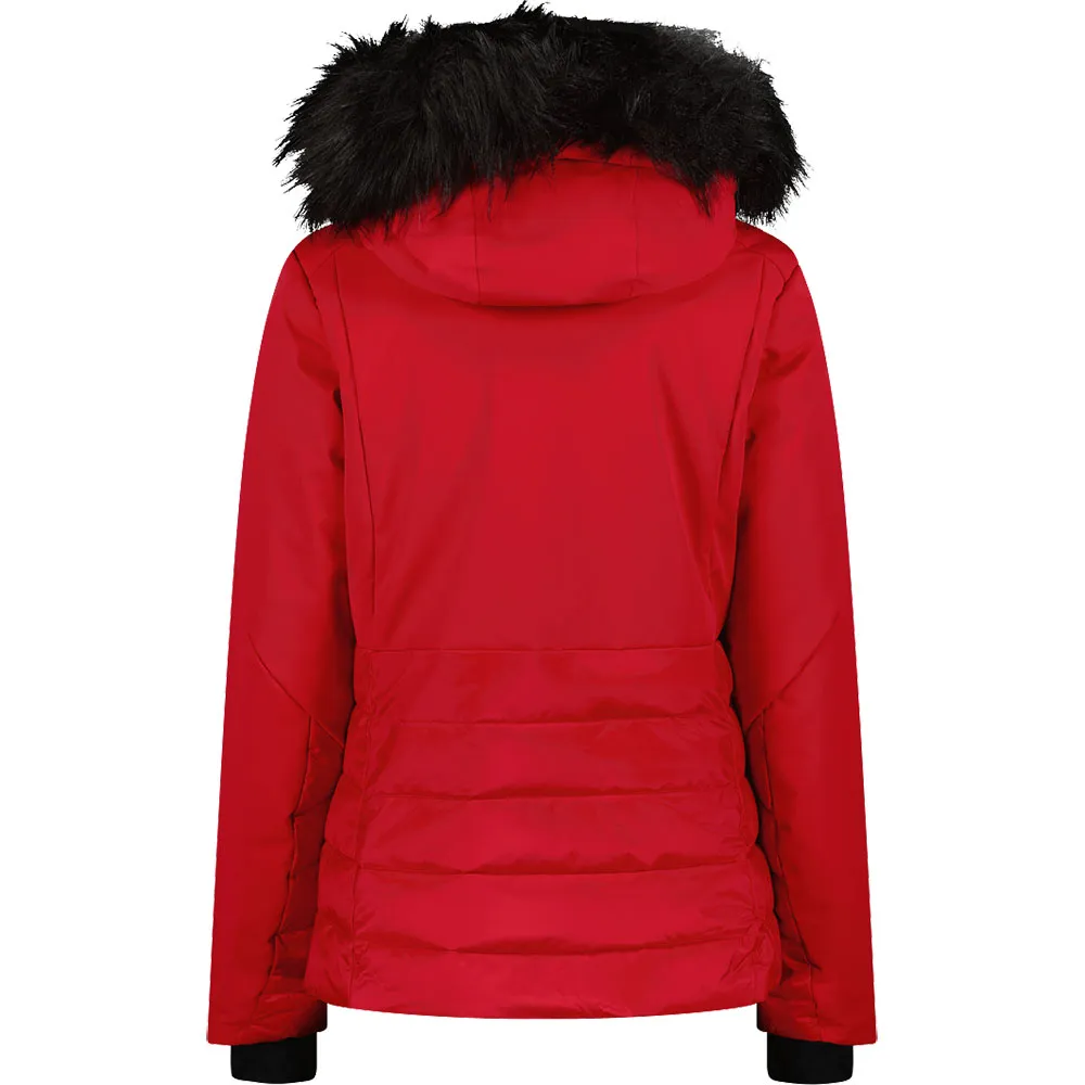 Plagget kompletteras av den avtagbara huvan med fuskpäls, dragkedjan fram med vindtät och skavfri flik, den justerbara nederkanten med dragsko, två sidofickor med dragkedja och en liftkortsficka på ärmen