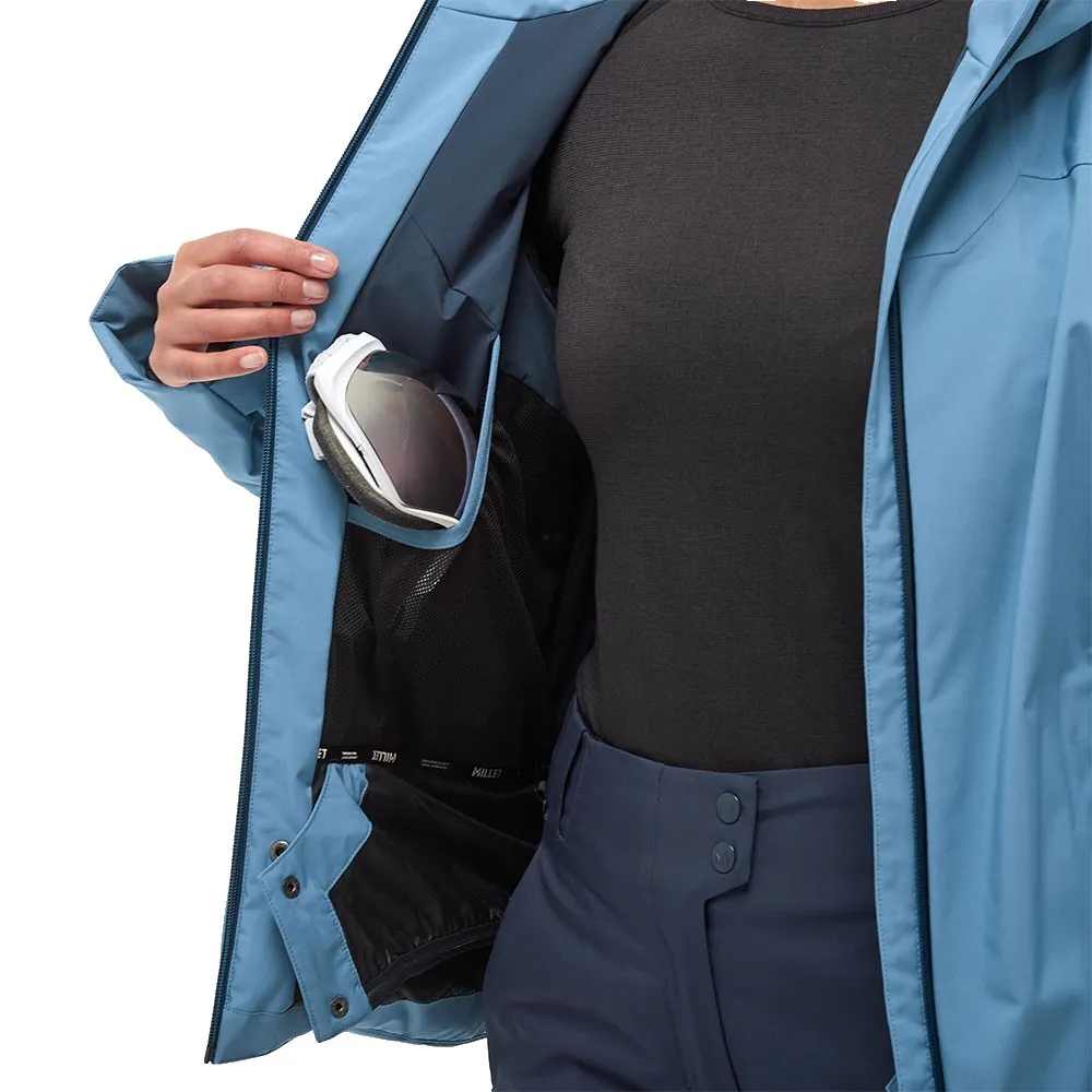 Erövra berget i MILLET Brevent skidjacka. Designad med en smickrande feminin passform, kombinerar den stil med hög prestanda. Håll dig varm och torr tack vare dess helt vattentäta DRYEDGE™ 20K/20K-tyg och 100 % återvunna REPREVE®-isolering. Det tvåvägsstretchmaterialet säkerställer total rörelsefrihet, medan sidoventiler låter dig reglera din temperatur. Fullpackad med funktionella fickor för ditt liftkort och dina skidglasögon, är denna mångsidiga jacka perfekt för backarna och vardagliga vinteräventyr