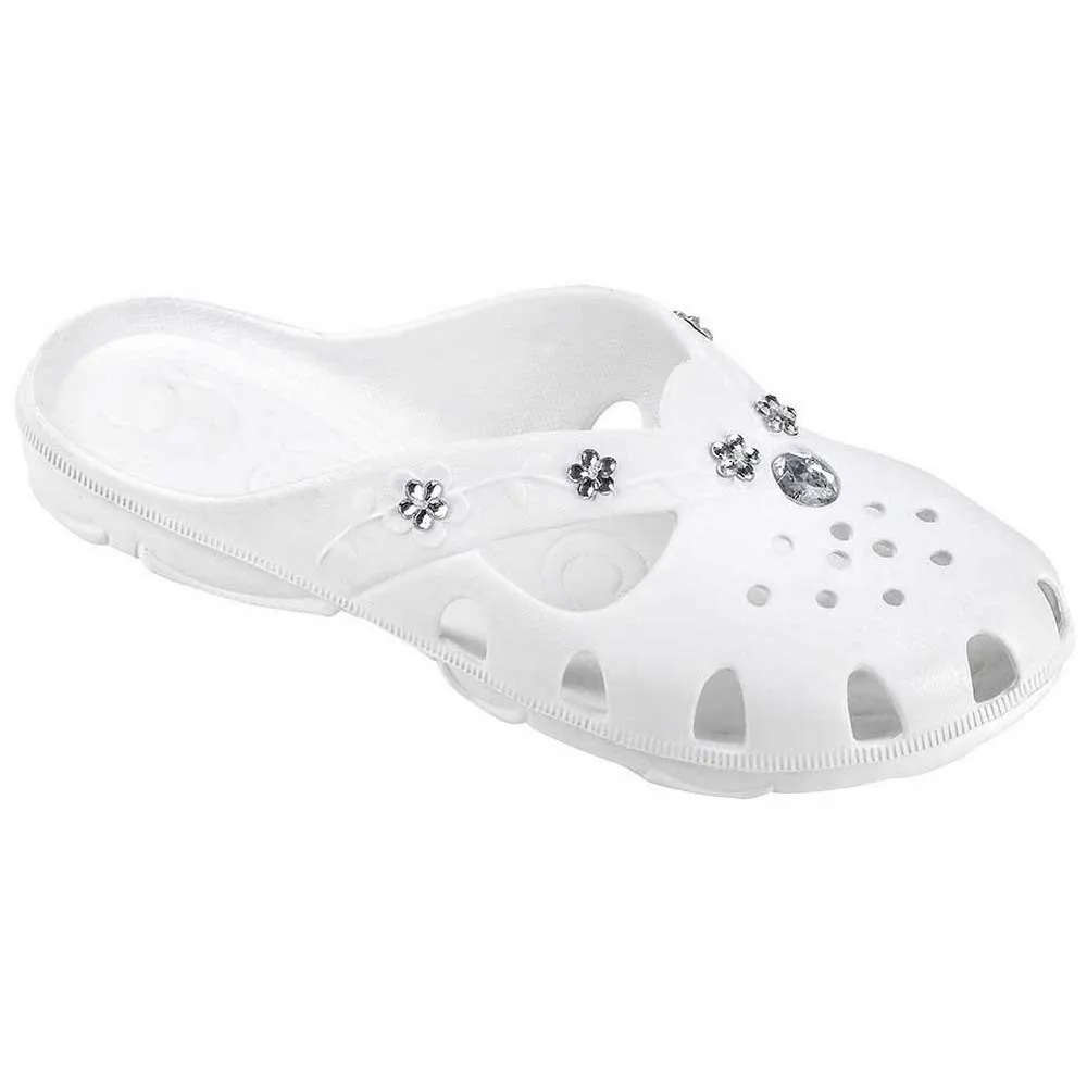 Købte disse i årevis (oprindeligt i Spanien på ferier, hvor de var meget billige og blødere materialer). Ganske dyre i forhold til, hvad de er, men de holder i evigheder (selvom juveler har en tendens til at falde af). Sise . Meget behagelig at bruge som hjemmesko, udenfor og fantastisk til rund pool på ferie som skridsikker. Nem at holde ren. En skam, at de stadig ikke kommer i forskellige farver, som de plejede. Købte flere par i sort/hvid str. 4.5 men skulle have købt 4'ere da de er lidt store.