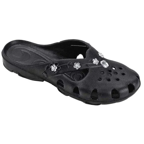 Købte disse i årevis (oprindeligt i Spanien på ferier, hvor de var meget billige og blødere materialer). Ganske dyre i forhold til, hvad de er, men de holder i evigheder (selvom juveler har en tendens til at falde af). Sise . Meget behagelig at bruge som hjemmesko, udenfor og fantastisk til rund pool på ferie som skridsikker. Nem at holde ren. En skam, at de stadig ikke kommer i forskellige farver, som de plejede. Købte flere par i sort/hvid str. 4.5 men skulle have købt 4'ere da de er lidt store.