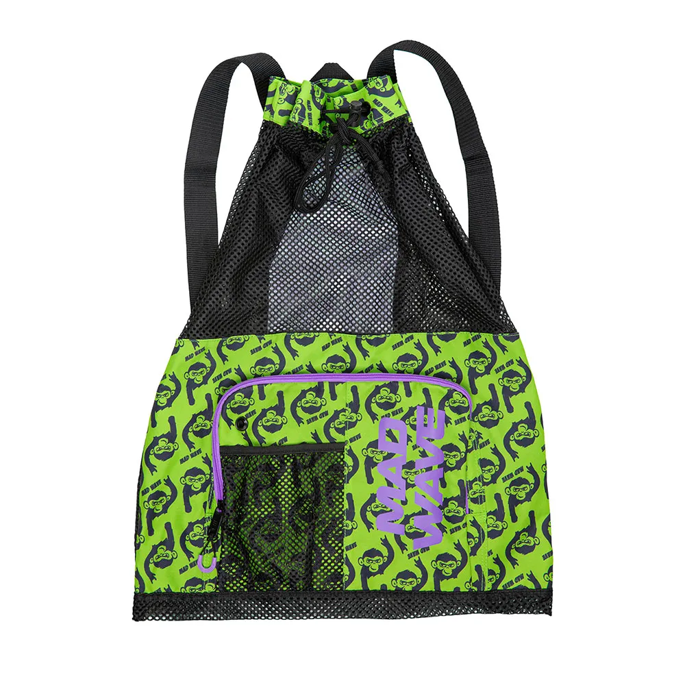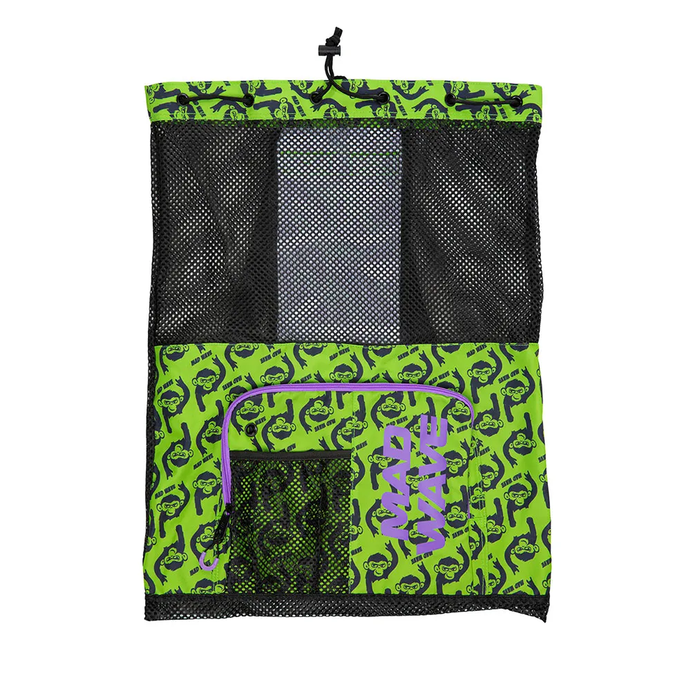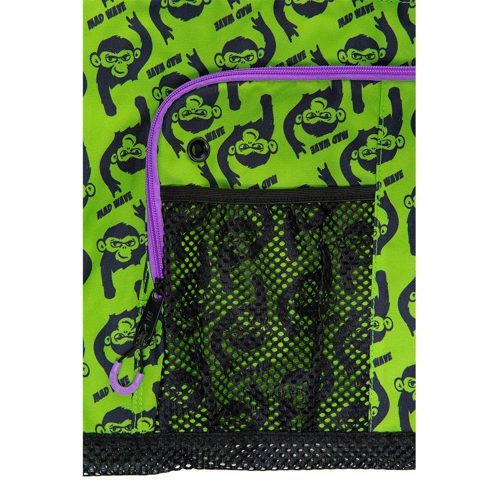 Der er en stor lynlåslomme med mesh-indsats foran, der nemt kan rumme flip-flops, svømmebriller og badehætter.