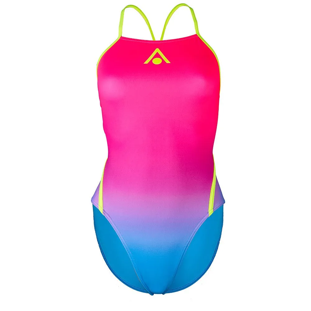 The AQUASPHERE Essential Diamond Back Adjustable Swimsuit is a vibrant and stylish women's swimwear option perfect for a day at the beach or a swim in the pool. This one-piece swimsuit features a multicolor and yellow pattern that is sure to catch the eye and make a statement.