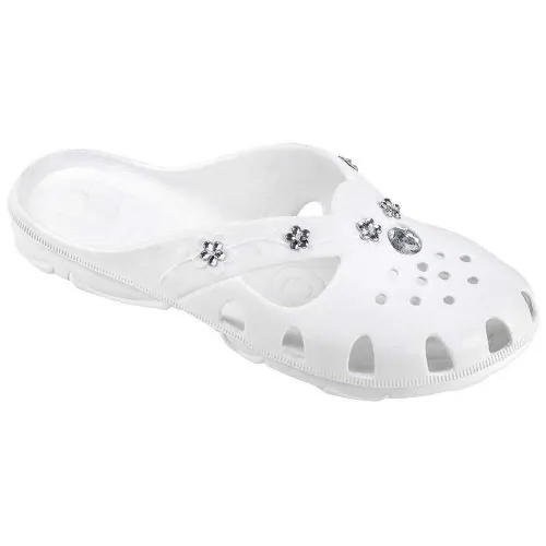 Bought these for years (originally in Spain on holidays when they were very cheap and softer materials). Quite expensive for what they are but they last ages (even though jewels tend to come off). Sise . Very comfortable to use as slippers, outside and great for round pool on holiday as non slip. Easy to keep clean. Shame they don't still come in various colours like they used to. Bought several pairs in black and white size 4.5 but should have bought 4s as they are a bit big.