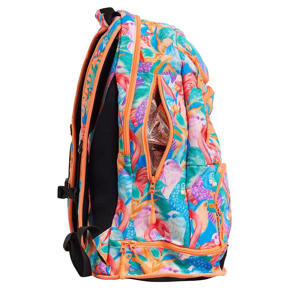 Mesh compartment and cooler bag zip pocket to keep drinks and food cool.