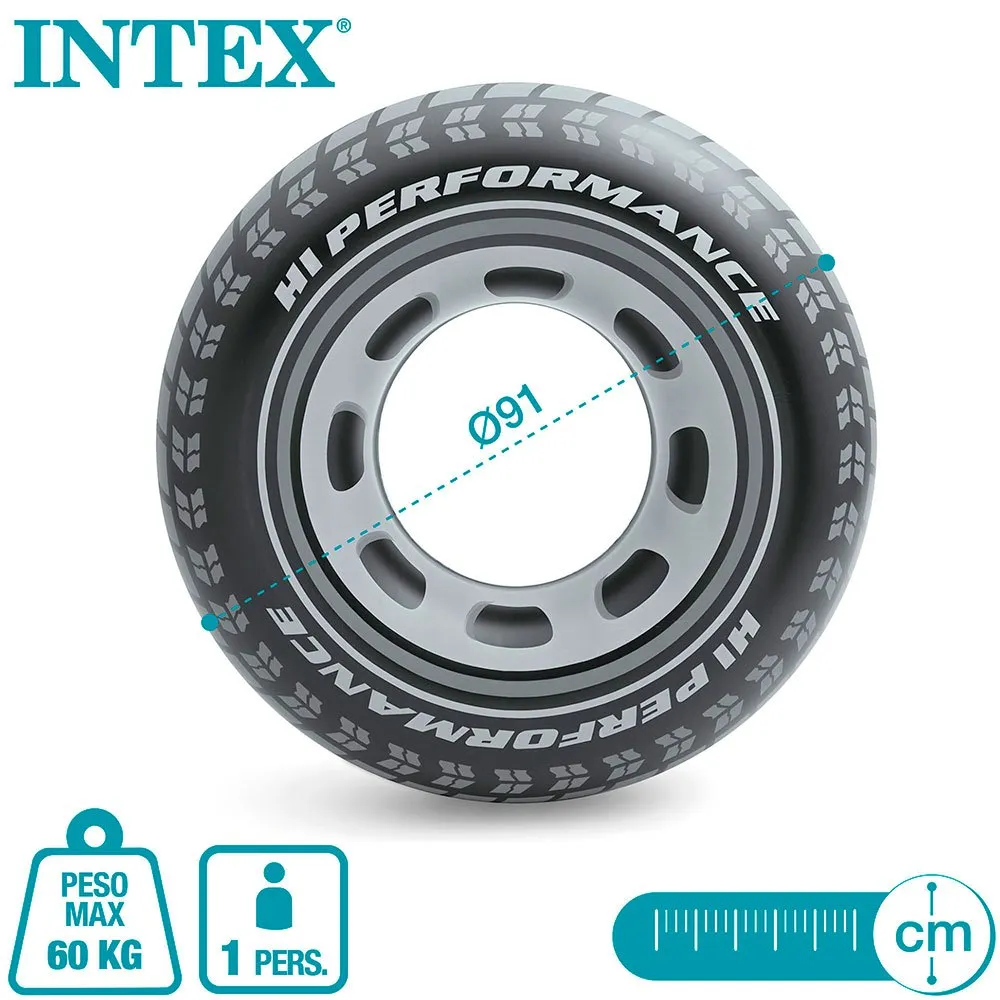 Inflatable tyre from Intex Float type inflatable of 91cm in diameter (79cm interior diameter) made from high quality vinyl material with a black design that resembles a real tyre.