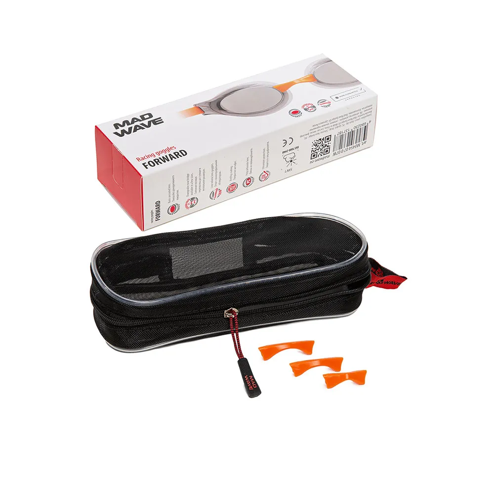 Unleash your maximum speed with MADWAVE Forward racing goggles, designed for professional athletes. Their streamlined, low-profile design cuts through the water, reducing drag for peak performance. The teardrop lenses offer enhanced front and side vision, letting you keep an eye on the competition. A secure, rigid fit ensures they stay put during starts and turns. Customize your fit with 3 nose bridges and an adjustable double strap. With UV protection, anti-fog coating, and World Aquatics approval, you´re ready for any race. Includes a protective mesh case