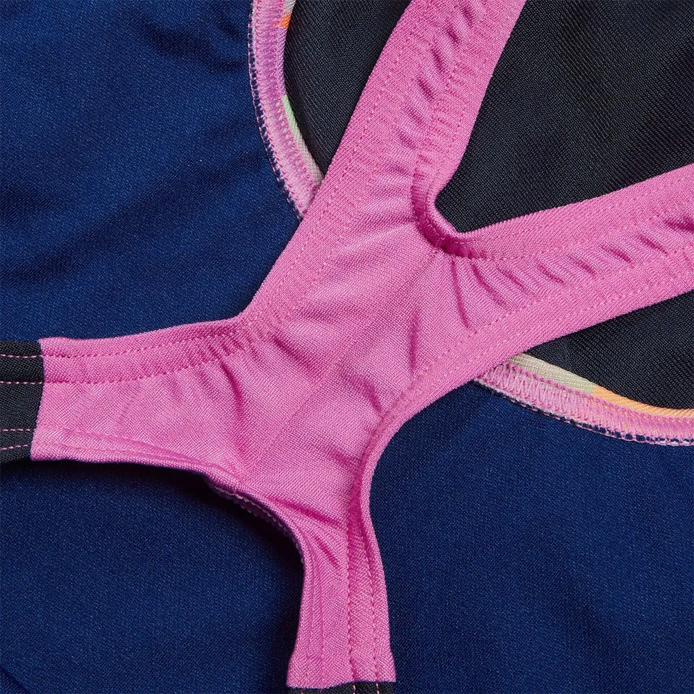 Featuring sleek, bold colors, lined graphics and an oversized pink Boom logo, the Splashback Swimsuit is packed with positive vibes.
