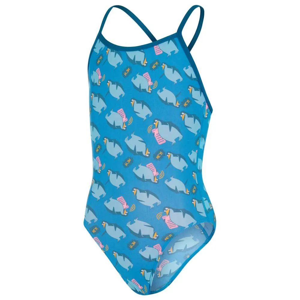 Bring your personality to the pool with our brightly coloured VBack suit, emblazoned with a fun print of phone-wielding penguins go-to for junior training. Offering a modest cut for junior swimmers, the simple V Back is comfortable to train in and provides maximum freedom of movement. Fully front lined in for comfort and modesty. Designed to be durable and better for the environment, it’s made from our new ECO Endurance+ fabric, which is 100% chlorine resistant, quick-drying and made using 50% recycled materials.