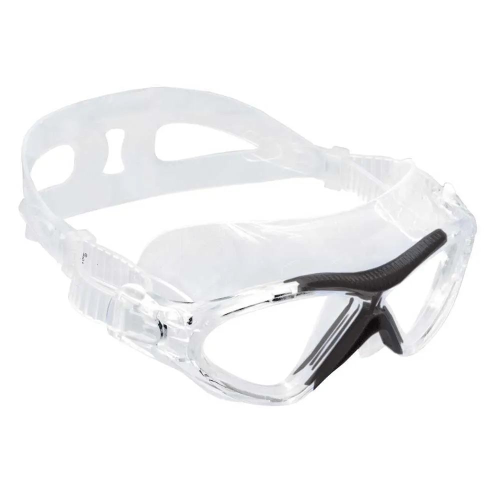 Kaksilinssiset uimalasit, joissa on läpinäkyvä silikonireunus ja -hihna mukavuutta ja turvallista istuvuutta varten.