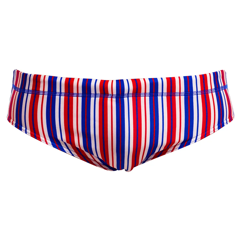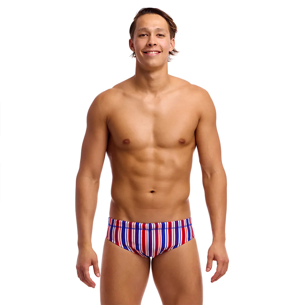 Hallitse rataa Funky Trunks Classic Brief -uimahousuilla, äärimmäinen valinta uimareille, jotka hakevat suorituskykyä ja persoonallisuutta. Valmistettu poikkeuksellisen kestävästä, 100 % kloorinkestävästä kankaasta, nämä uimahousut säilyttävät eloisan värinsä ja muotonsa, vastustaen ankaria allaskemikaaleja ja UV-säteitä. Klassinen 8 cm:n sivuleikkaus tarjoaa täydellisen liikkumisvapauden, kun taas kiristysnyöri, etuvuori ja litteät saumat takaavat turvallisen, mukavan ja hiertymättömän istuvuuden. Tee vaikutus rohkeilla, ikonisilla printeillä, jotka antavat sinun ilmaista tyyliäsi ja sukeltaa veteen itsevarmasti