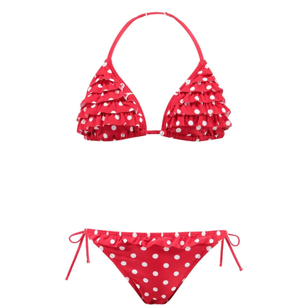 Il triangolo Bells con stampa a pois è il bikini perfetto per avventure estive senza sforzo sulla spiaggia! Presenta un top a triangolo con volant e spalline regolabili.