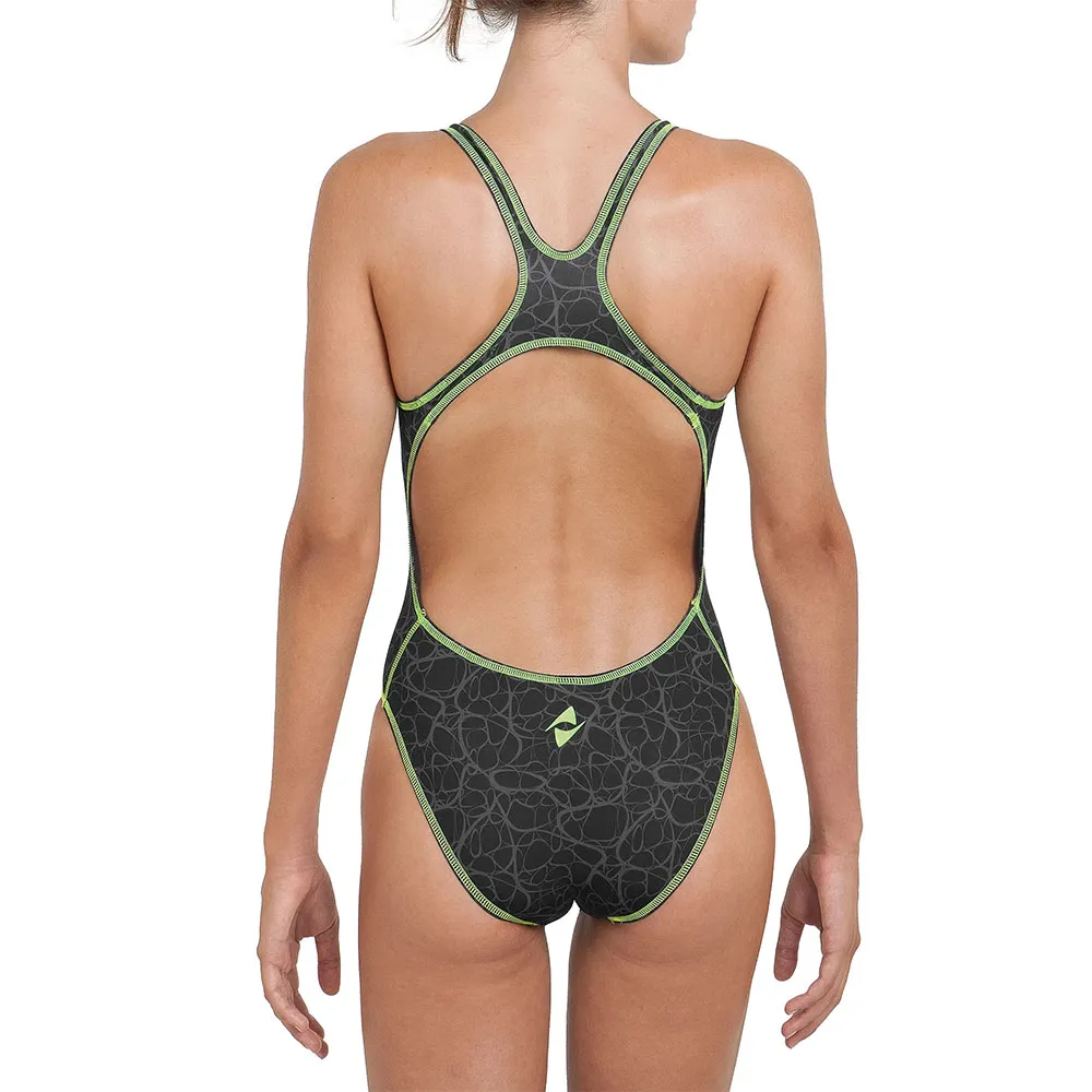 One-piece zwempak "FLUYD Design" met X Stretch stiksels in zure groen. De Revolutional® Shiro "Carvico" stof, gemaakt in Italië, maakt het comfortabel, elastisch en hoog presterend.