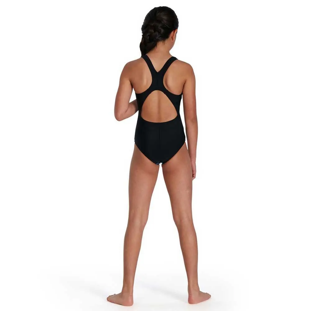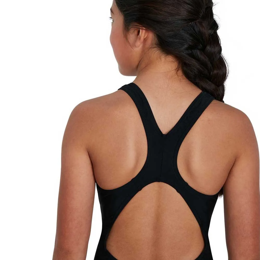 Straal vertrouwen en energie uit in dit stijlvolle zwarte splashback-badpak met een opvallende blauwe bolvormige print. Ideaal voor training en lessen, het Splashback-ontwerp omvat riemen die weg van de schouders zijn geplaatst om de bewegingsvrijheid te vergroten, zodat jonge zwemmers kunnen trainen zonder zich beperkt te voelen. Gemaakt van onze zachte en rekbare Endurance10-stof, biedt het een hogere chloorweerstand dan standaard badkledingstoffen en past het langer als nieuw met Creora® Highclo™.