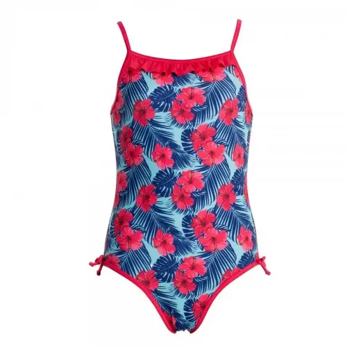 Meisjes zwempak met een levendige full-colour print en details aan de zijkanten en borst.