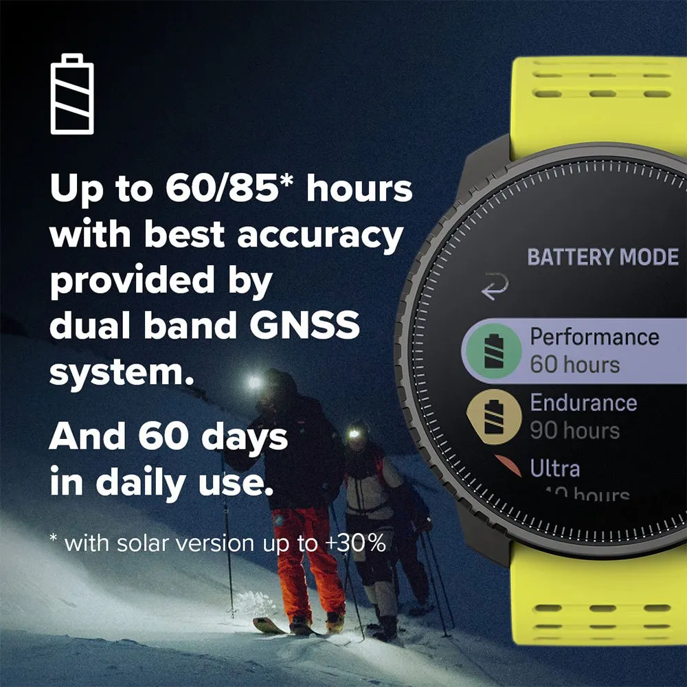 - Med Suunto Vertical trenger du ikke å gjøre noen kompromisser med batterilevetid og presisjon, da den bringer det beste av begge. Den ekstremt lange batterilevetiden på opptil 500 timer med kontinuerlig treningssporing i turmodus og opptil 60 timer i den mest nøyaktige dual-band GNSS-sporingsmodusen, blir ytterligere forsterket med solopplading i titaniumsolvariantene som bringer minst 30% mer kraft på solfylte dager. I dagmodus følger Suunto Vertical deg i måneder uten å lade!