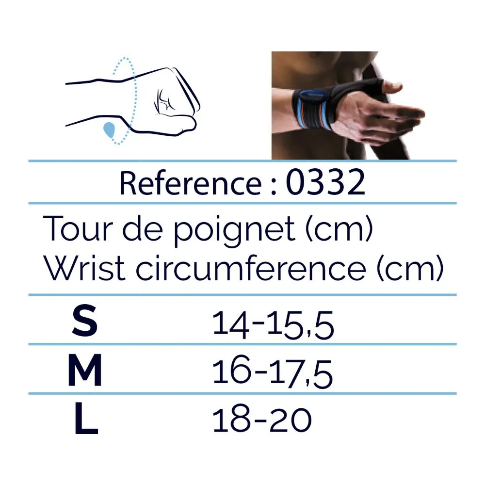 Neopren håndledd og tommelstropp for innendørssport (håndball, basketball, volleyball, ...) Indikasjoner : Forebygging av leddbåndskader (forstuinger). Gjenopptagelse av aktivitet etter en forstuing. Skjøre tommelbånd Støttenivå: 4/5 dynamisk mobilisering Farge: Svart Størrelser: S til L Sammensetning: 48% Polyamid, 36% Neopren, 8% Polyester, 7% Elastan, 1% Polyuretan Kan vaskes i maskin på 30° Dette produktet er en regulert medisinsk utstyr og er som sådan CE-merket. Les bruksanvisningen før bruk.