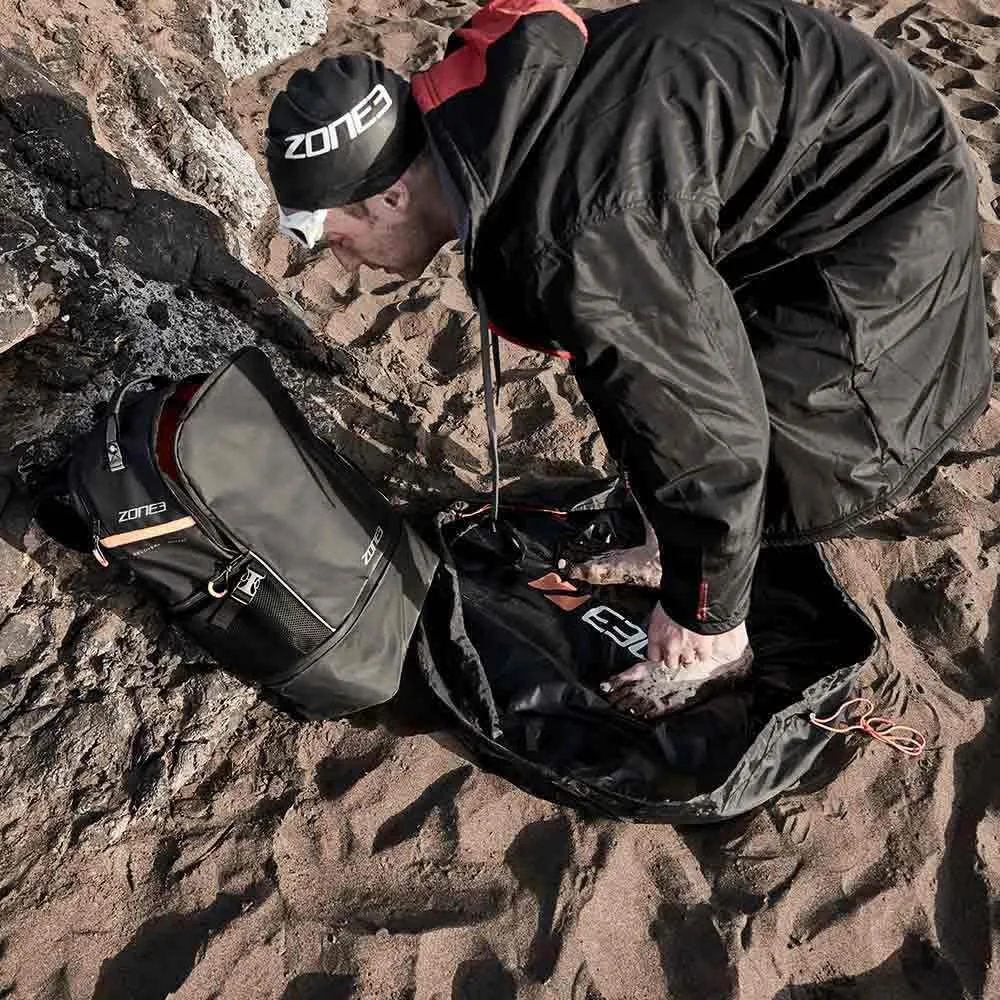 Den nye skifteunderlaget fra Zone3 er det essensielle tilbehøret for åpent vann. Den slitesterke konstruksjonen kan brukes på alle overflater, enten nede på stranden, på en gressbakke eller på en parkeringsplass, og holder føttene trygge og beskyttet. Den praktiske snoren gjør at den raskt kan forvandles til en bag for å oppbevare alle våte gjenstander, klar til å transporteres hjem.