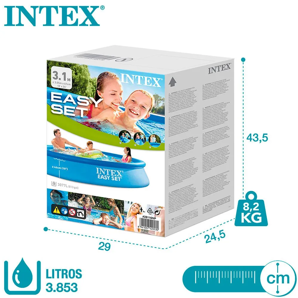 Intex Easy Set składany ośmiokątny basen z nadmuchiwanym górnym pierścieniem, o wymiarach: 305x76 cm. & Nbsp; Ta pula ma pojemność 3 853 litrów wody i jest przeznaczona dla 4 osób w wieku powyżej 6 lat. Płótno wykonane w technologii SuperTough i trzy warstwy bardzo mocnego laminowanego materiału, który zapewnia wysoką wytrzymałość i trwałość & nbsp;