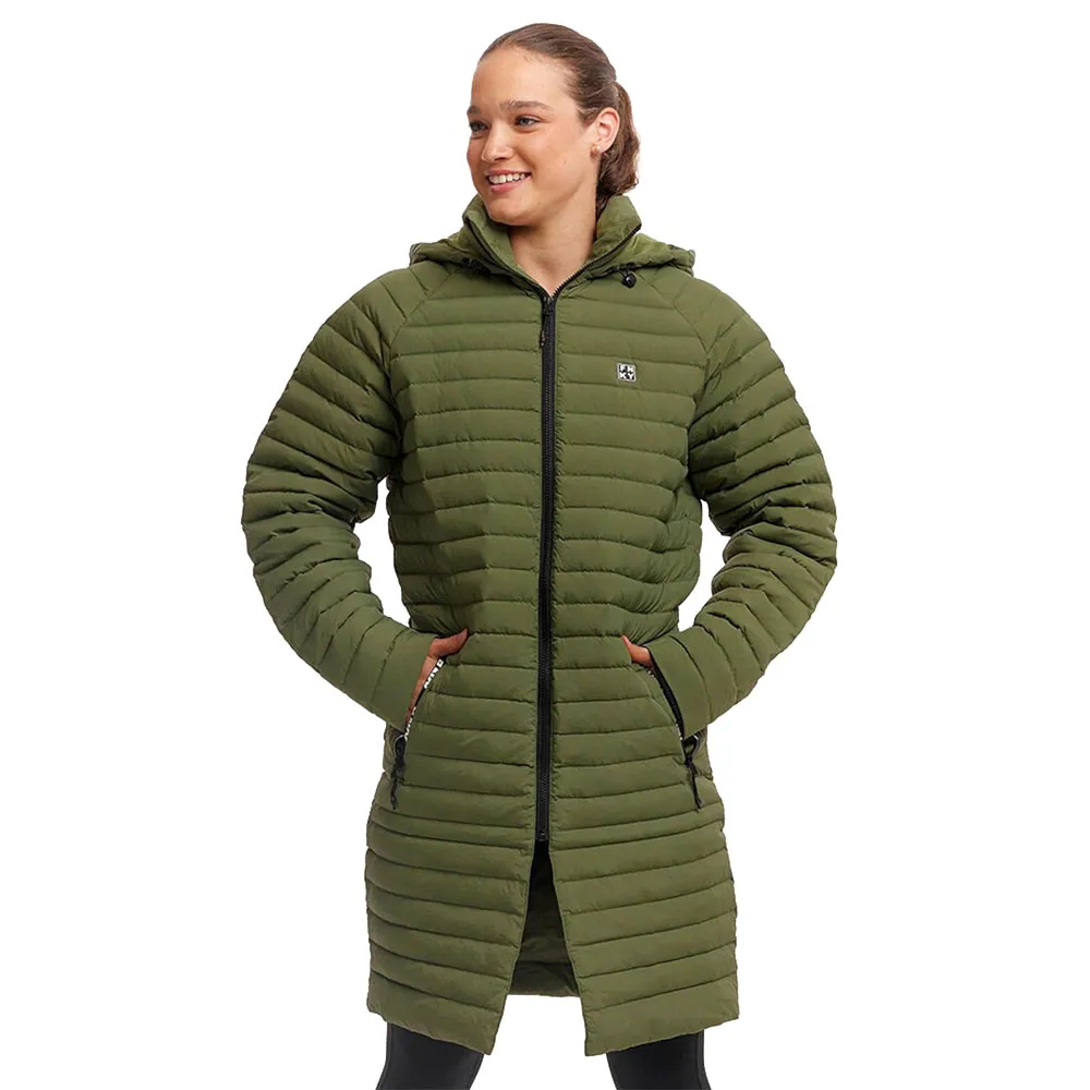 Um casaco de convés versátil, preenchido com penugem de pato, que pode ser convertido de uma jaqueta na altura do quadril para um casaco na altura do joelho, simplesmente estendendo a seção inferior magnetizada.