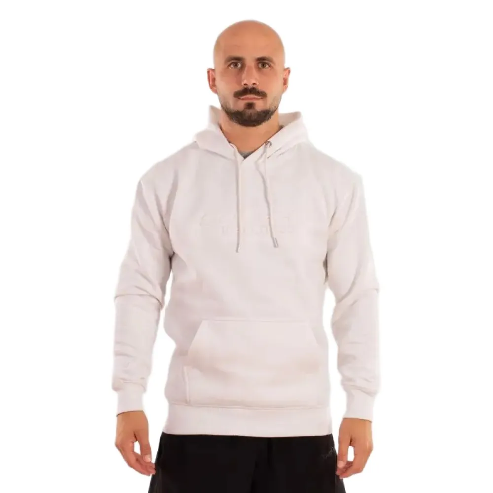 Moletom com capuz feito de tecido de algodão macio e confortável. Possui um design clássico com um bolso canguru na frente e cordões ajustáveis no capuz com pontas de metal. O logotipo da marca é gravado no peito, criando um efeito em relevo que adiciona um estilo moderno e sofisticado.