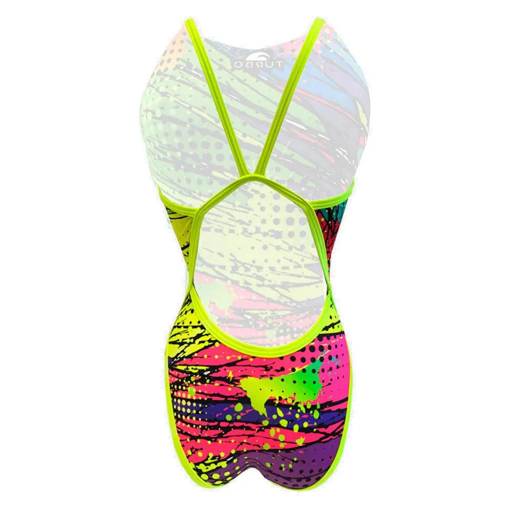 Turbo usa o tecido anti cloro mais resistente do mundo. Comprovado para durar em um ambiente de cloro severo. Esta roupa de banho é ideal para longas sessões de treino na piscina ou no mar, uma vez que não se esfrega devido ao seu encaixe confortável. Este banho é perfeito para natação, pólo aquático, mergulho e muitos outros esportes aquáticos. O conforto e o ajuste de um maiô Turbo são como nenhum outro.