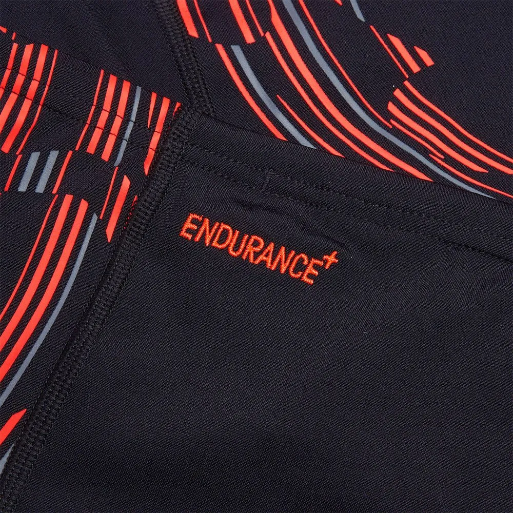 Продемонстрируйте безупречный стиль во время тренировок с этим приталенным черным спортивным купальником, украшенным эффектным графическим рисунком из изогнутых линий красных и серых тонов.