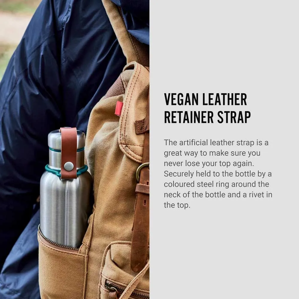 - Remmen i konstläder säkerställer att ditt lock inte försvinner och gör din flaska lättare att bära. Den hålls säkert fast i en stålring runt flaskans hals.