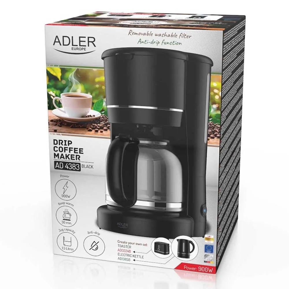 Adler AD 4383 Black drypkaffemaskinen kombinerer elegant design, funktionalitet og pålidelighed — skabt til alle, der værdsætter bekvemmelighed og god smag.
