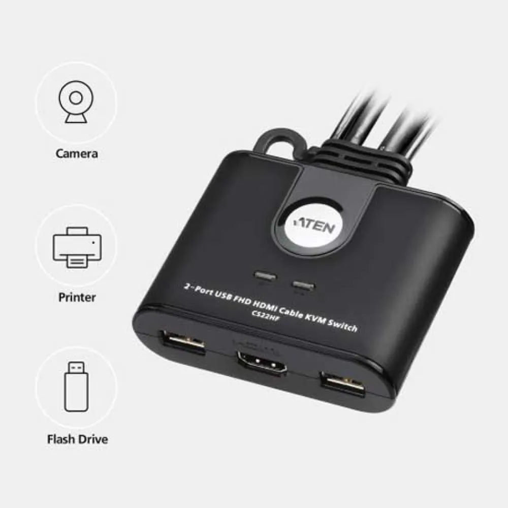 ATEN 2-port FHD HDMI USB KVM Switch i kabelformat.