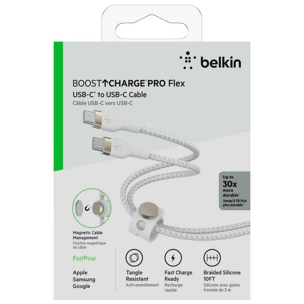 Oplev den ultimative opgradering inden for opladning med Belkin BOOST↑CHARGE™ PRO Flex USB-C-kablet. Konstrueret med en dobbeltflettet silikoneyderside er det op til 30 gange mere holdbart end almindelige kabler og modstår sammenfiltring, flossning og knæk. Dette 3m kabel understøtter USB-C PD hurtigopladning og oplader kompatible enheder fra 0-50% på kun 26 minutter. Hold dit område ubesværet ryddeligt med det medfølgende magnetiske kabelstyringssystem, som giver dig mulighed for nemt at opbevare og montere dit kabel overalt. Det er den perfekte kombination af fleksibilitet, styrke og stil til alle dine USB-C-enheder