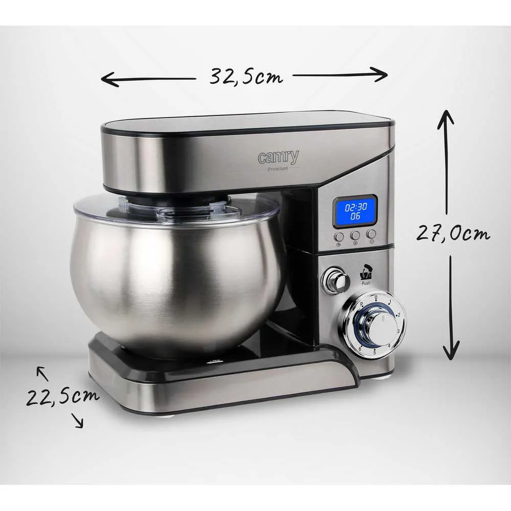 Løft dine køkkenkreationer med CAMRY CR 4223 planetkøkkenmaskinen. Dens kraftfulde 2000W motor, 6 hastigheder og pulsfunktion klarer enhver opgave, fra æltning af tung brøddej til piskning af lette marengs. Planetblandesystemet sikrer, at alle ingredienser blandes perfekt i den store 5.0L skål i rustfrit stål. Denne stilfulde røremaskine inkluderer en æltekrog, en rørespade og et piskeris, samt et stænklåg og et LCD-display for præcis kontrol. Stabil, kraftfuld og alsidig. EU-stik