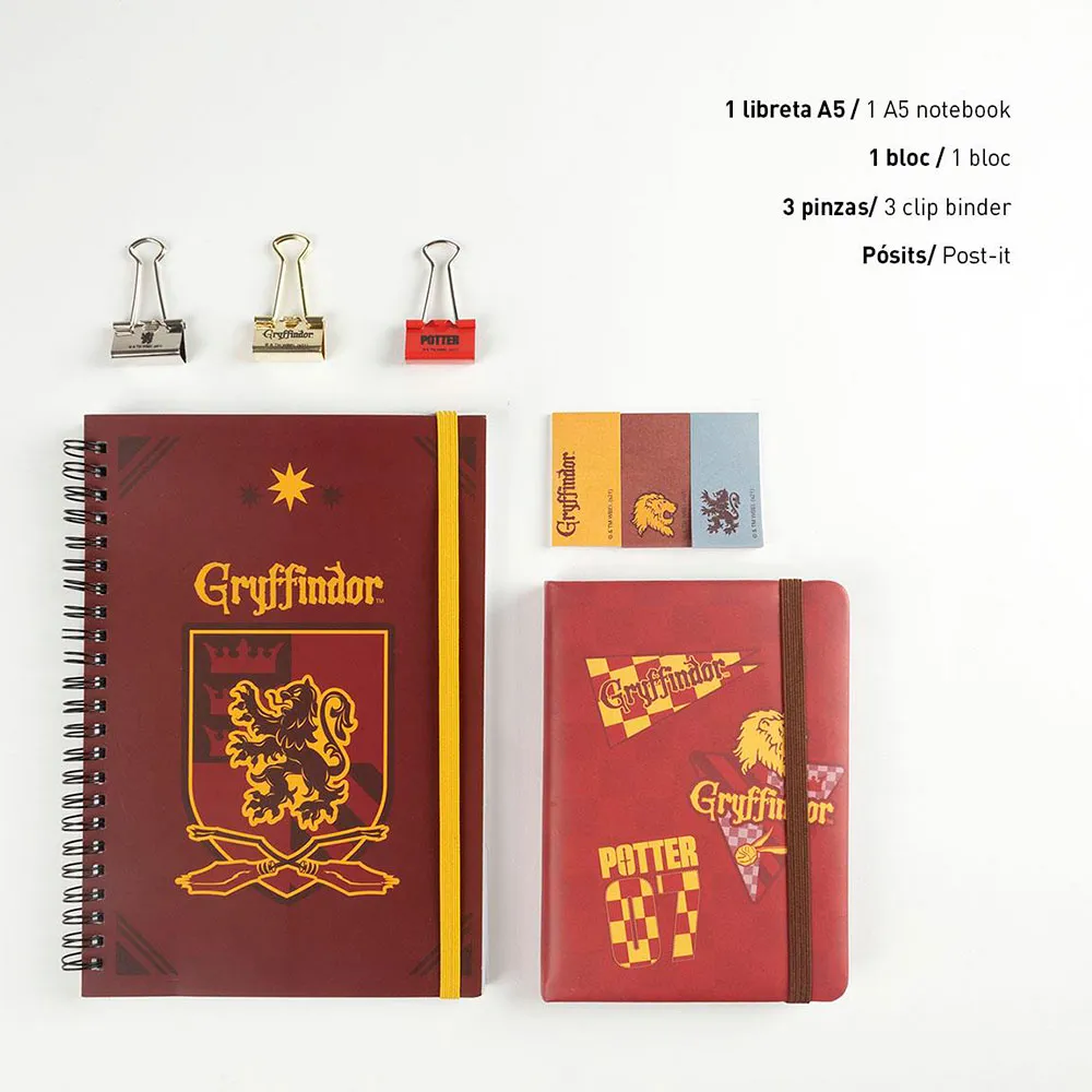 1 x Blok Notesblok: En praktisk notesblok til hurtige notater, huskelister og korte beskeder. Ideel til at have liggende på skrivebordet for øjeblikkelig adgang 3 x Klemmebindere: Hold dine løse papirer, vigtige dokumenter og lektier sikkert fastgjort med tre robuste og stilfulde clips, hver med Gryffindor-tema.