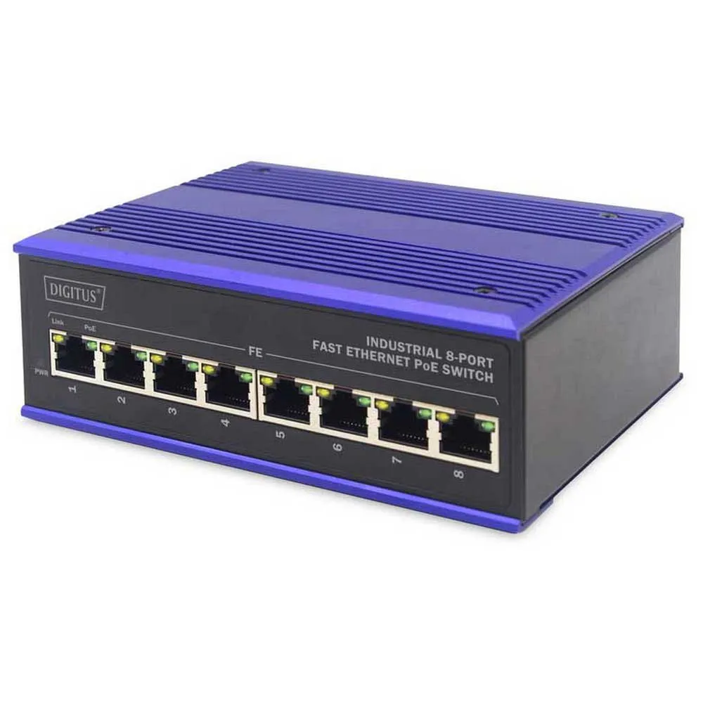 - Den industrielle Ethernet Switch har 8 RJ45 PoE-porte med hurtige Ethernet-hastigheder og leveres i et robust, kompakt sort og blåt metalhus.